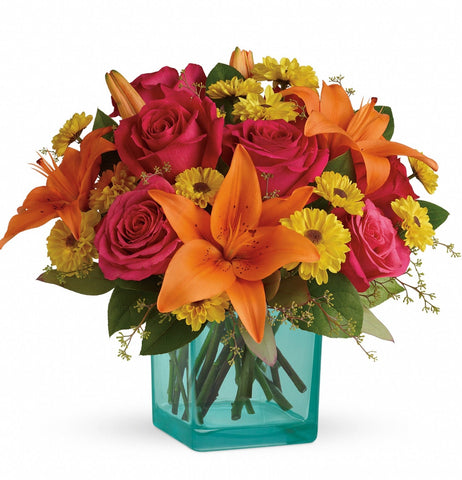 Roses, lilies and asters in precious gemstone colors of garnet are nestled into a clear glass vase, creating a graceful presentation. Purple chrysanthemums and seafoam statice add a special touch. A beautiful bouquet for any occasion!