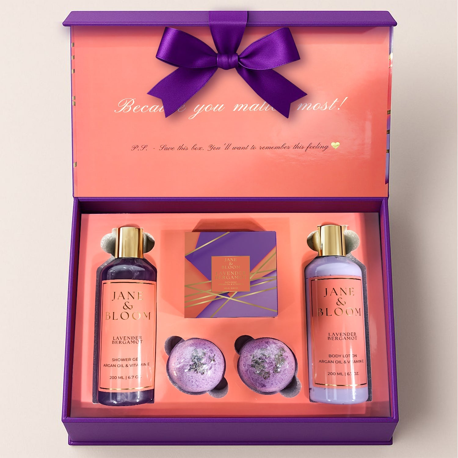 Bring the spa experience home with the Jane & Bloom Lavender & Bergamot Spa Gift Set. This luxurious collection includes a rejuvenating Shower Gel, a silky Body Lotion, a gentle Bath Soap, and two fizzing Bath Bombs — all infused with the calming scent of lavender and the refreshing brightness of bergamot.